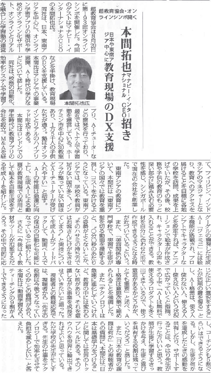 全私学新聞に第193回オンラインシンポ「生成AIによるデジタル教育~これからの時代の学びとは」について掲載 メディア|メディア掲載 2025.8.20 Wed 全私学新聞 令和7年8月20日 超教育協会・オンラインシンポ開く 本間拓也マナビーインターナショナルCEO招き 日本や東南アジア中心に教育現場のDX支援
