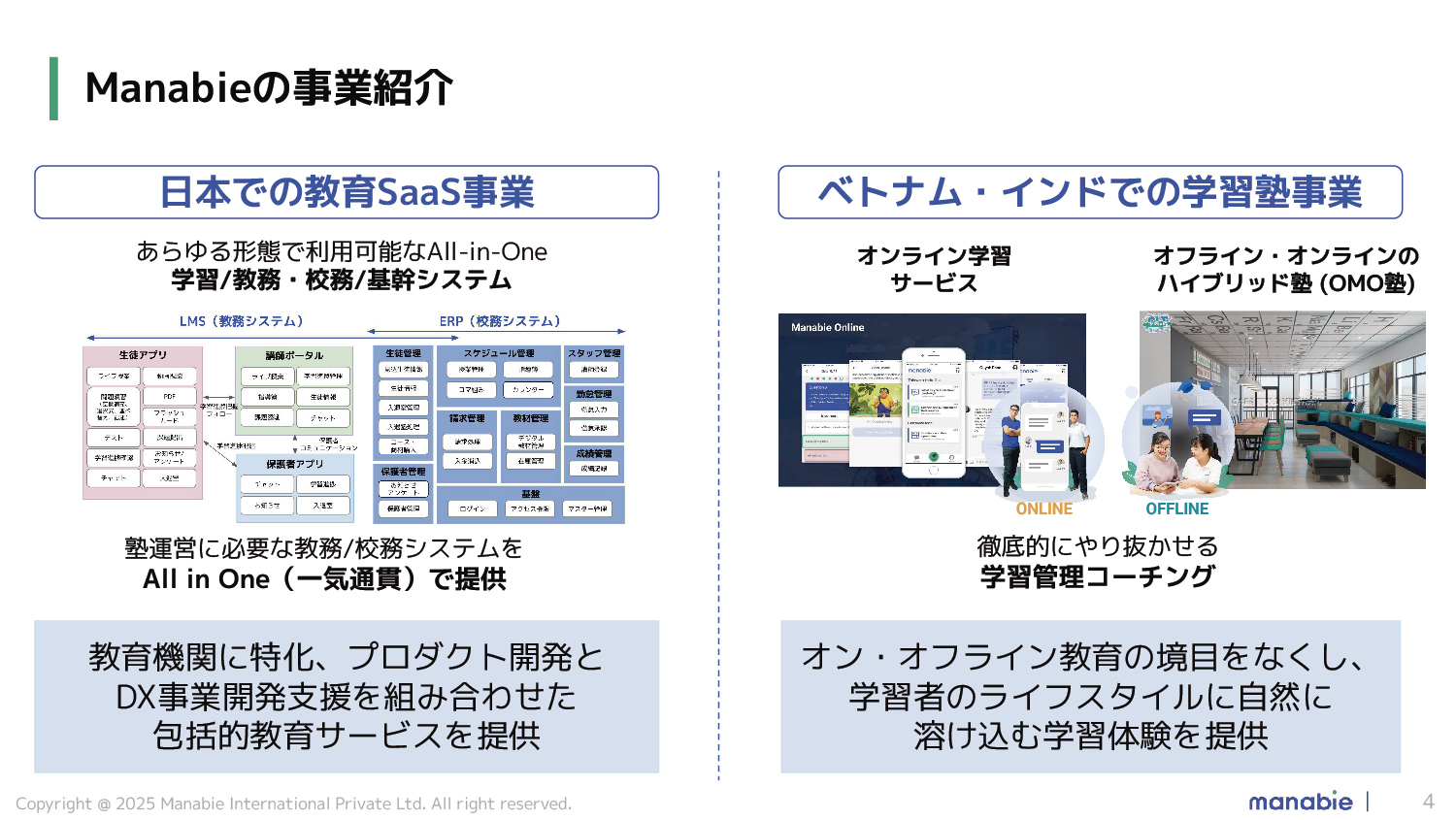 ベトナムを中心とした学習塾事業と日本における教育SaaS事業を展開