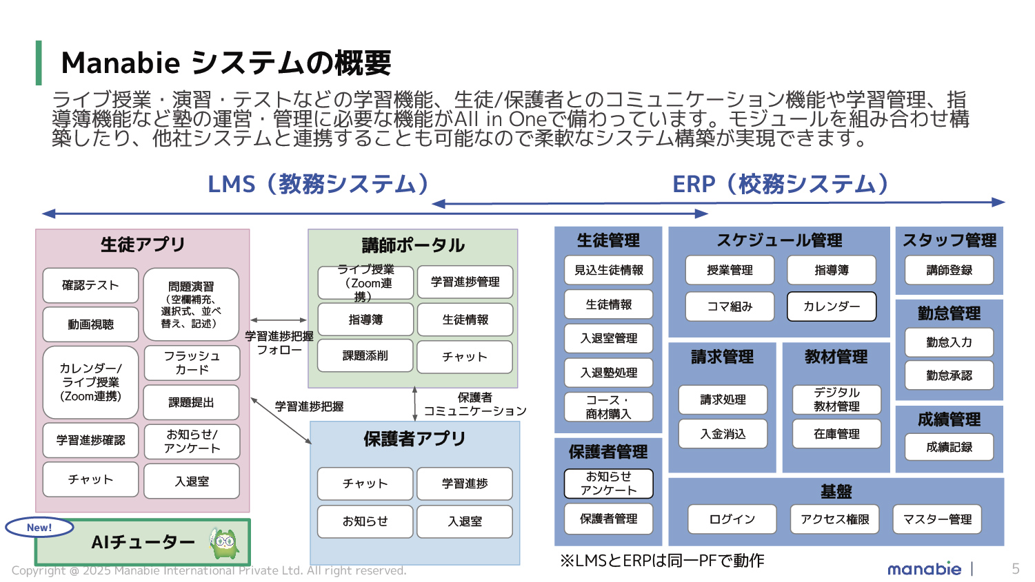 Manabieでは、生徒、講師、保護者が活用する教務システム(LMS:Learning Management System)と、主に学校職員が活用する校務システムを提供しています。コロナ禍を経て生成AIが登場し、現在はこうしたさまざまな業務の中で自動化できる部分がかなり見えています。