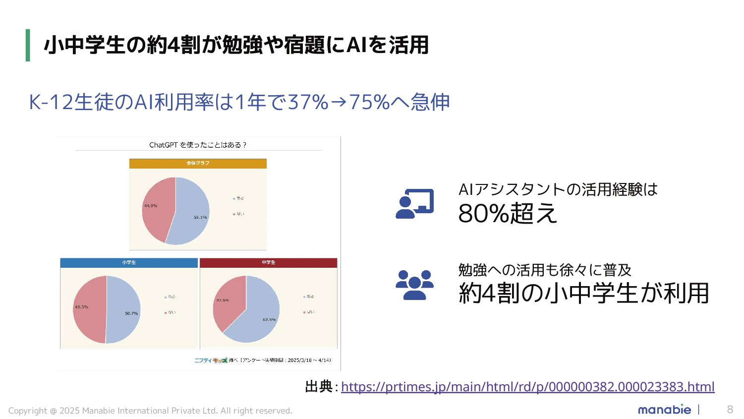 日本国内では現在、生成AIが教育現場でも広く利用されています。小学生や中学生でも日常的に使っていて、小中学生の約4割が宿題やレポートにAIを活用しています。