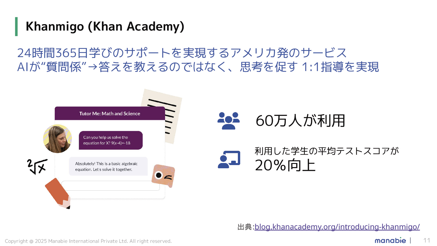 日本と同様に海外でも、かなりの生徒がすでにChatGPTのような生成AIを普段の勉強の中で使っており、さらにはそれらをサポートするサービスも登場しています。Khan Academyは有名なサービスです。khanmigoというAIチューターが、すでに多くの生徒たちに使われていて、実際に成績向上といった成果にもつながっています。