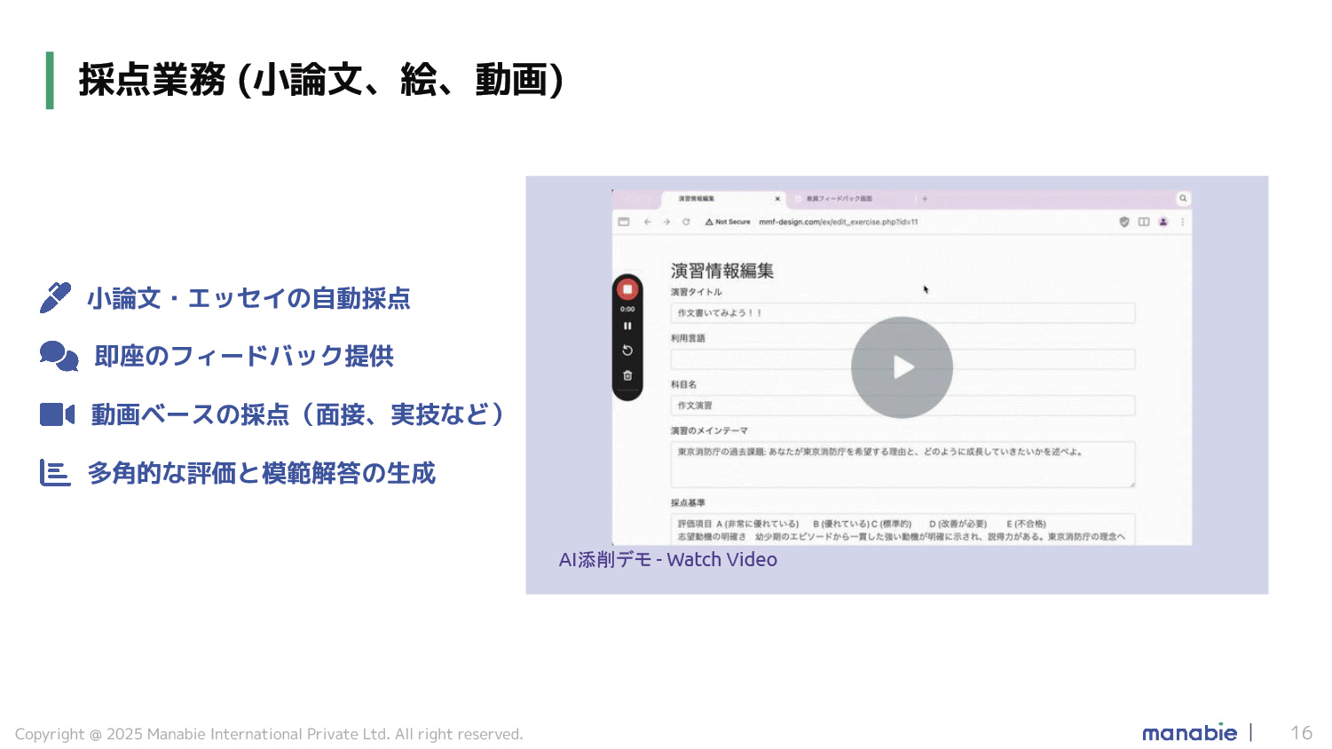 生成AIにより採点できるのは文字情報だけではなく、動画の採点も可能です。例えば、美容専門学校で生徒がハサミで髪を切る動画を撮り、それに対して『ここの姿勢が違う』、『ハサミの持ち方違う』などのポイントを、動画の秒数ベースで指摘できます。『1分23秒の動画に対してフィードバックがあります』というかたちです。このように実技的な学習に対するフィードバックもスピーディーにできるので、学習の高速化と精度の高さにつながります。非常にエキサイティングな領域だと思っています。
