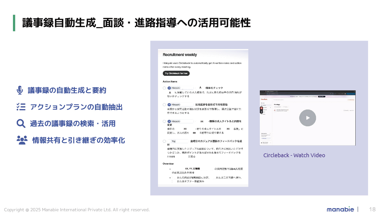 また、議事録アプリも多くの皆さんがすでに使われていると思います。教育の領域の中でも、例えば、進路指導、保護者や生徒との面談はもちろん保護者や生徒の許可を得た上で録音や録画をしてまとめたものをその場で共有したり、生徒と面談した内容を保護者にすぐレポートとして提供したり、進路指導でも生徒の学習状況や生徒のこれまでの状況をサマリーし、それをもとに進路指導のガイドラインを作っていき、アクションプランを作っていくなども、先進的なところで活用され始めています。