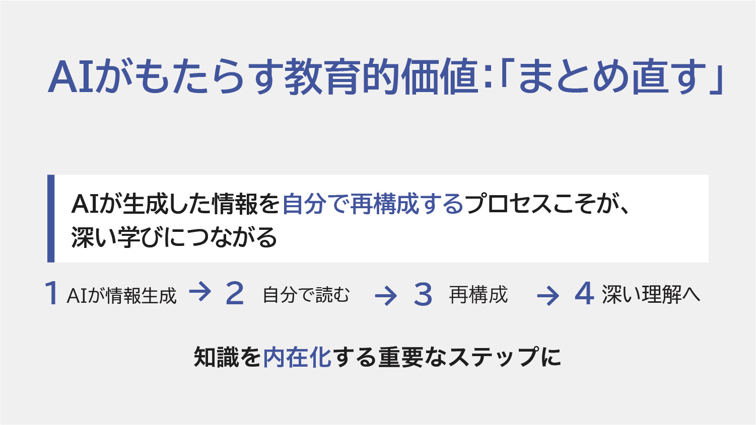生成AIが生成する情報は全てが正しいわけでも、分かりやすいわけでもありません。自分にとって分かりやすく、人にとっても分かりやすくするために、生成された情報を自分で読んで、それを自分で再構成して、さらにそこから自分にとって深い理解を得る作業、つまりはまとめ直すことが重要になります。