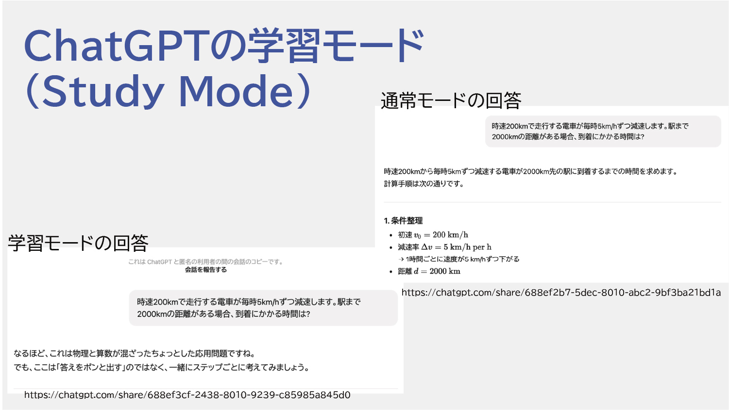 ここ半年ぐらいで生成AIの機能も変化してきています。具体的には学習のための機能が搭載されるようになってきています。例えばChatGPTには学習モードが搭載され、生成AIを家庭教師として活用することができます。実際、生成AIに宿題を手伝ってもらうことはいくらでもできるわけですが、このときに学習モードにすると、ChatGPTは答えを直接的に教えなくなります。きちんと対話しながら、ステップバイステップで、「あなたが聞いたことはこういうことですよね」、「こういう聞き方をしたのであれば実はこういう情報もあるのではないか」という形で、対話を通じて学習をサポートしてくれます。