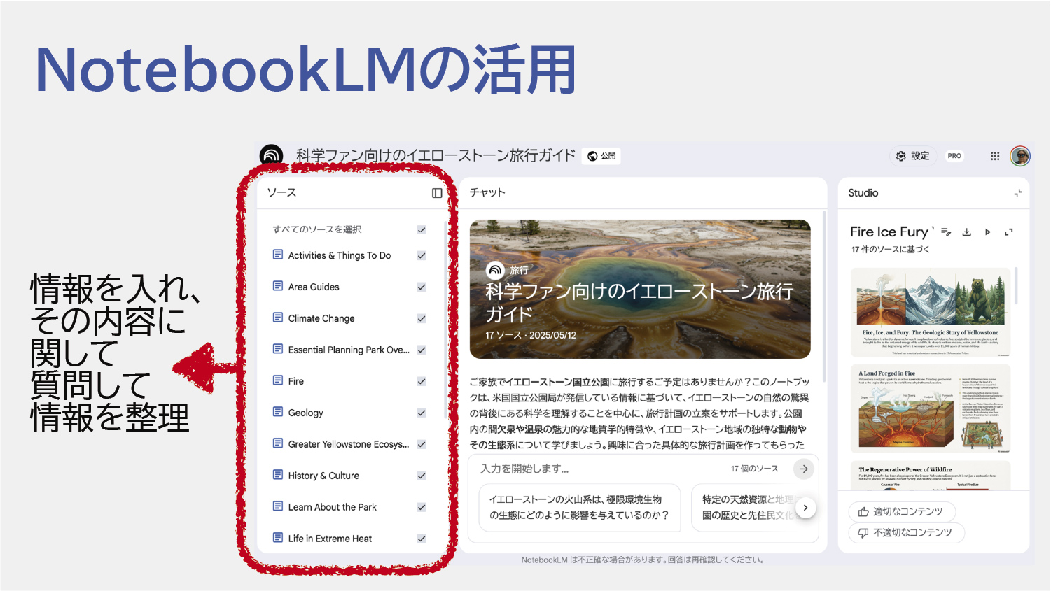 しかも、先ほどのイエローストーンの例であれば、NotebookLMが提示した答えを見ながら、「この部分はどういう意味ですか?」と更問いをしていくことで、より深い回答が出てきます。教育向けにまさに更問いをしながら学習するための道具として広く使っていただけるのではないかと思っています。このサービスは無料であることも見逃せません。