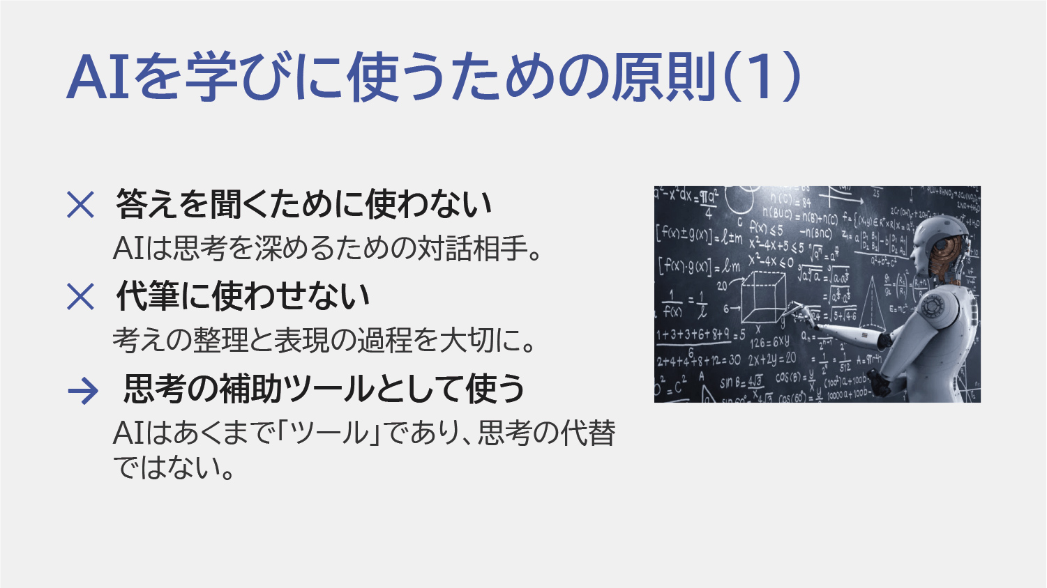 代筆に使わせないというのも重要なところです。そこで出てくる文章というのは、そもそも学習をする人のためのものではないです。例えば仕事のメールを代筆してもらうのなら良いかもしれませんが、学びで活用するなら、そこで出てきた文章から考えを整理して自分の言葉で書くための過程を大切にしなければなりません。それを子どもたちに伝えるべきだろうと思っています。そういう意味では、AIは思考の補助ツールであって、思考の根源ではないです。自分が考えるためにどこから情報を得るかというツールとして使うことに徹するのが大切です。