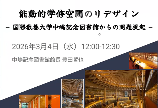 超教育協会は2026年3月4日、国際教養大学中嶋記念図書館 館長の豊田 哲也氏を招いて、「能動的学修空間のリデザイン – 国際教養大学中嶋記念図書館からの問題提起」と題したオンラインシンポジウムを開催した。