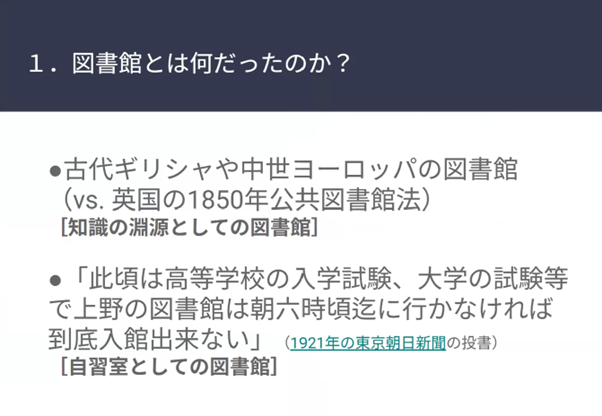 こうした図書館に求められてきた役割、図書館のイメージが現在、変化してきています。図書館を利用する多くの人は、「図書館であまり本を読んでいない」印象です。自分が持ち込んだ参考書を開いたり問題集で勉強していたりと、図書館の本を閲覧していない人も結構います。これは20世紀後半以降の現象かと思っていたのですが、1921年の東京朝日新聞の投書には「此頃は高等学校の入学試験、大学の試験等で上野の図書館は朝6時頃迄に行かなければ到底入館出来ない」とあります。戦前から、こういった状況だったのです。つまり、図書館を自習室や仕事部屋として使う人がたくさんいるのです。