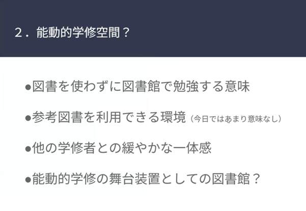 能動的ということは、各自が先生の話を一方的に聞いて学ぶ「受け身」ではなく、自ら図書館の本を使って、図書館という空間の中で学ぶという意味合いです。「能動的学修空間としての図書館」という考え方があっても良いと考えました。