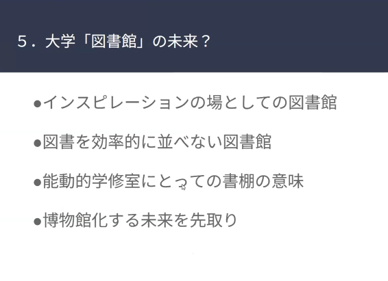 私は最初に、図書館は単なる自習室ではないと申し上げましたが、「能動的な」自習室としての機能にこそ大学図書館の本質があり、そこに大学教育の本質があり、大学の未来があると考えています。